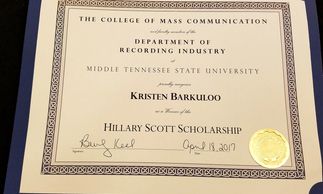 Kristen Barkuloo was pleased and honored to received the Hillary Scott Scholarship at the MTSU College of Media and Entertainment, Department of Recording Industry. Hillary Scott, of Lady Antebellum, attended MTSU from 2004 through 2006 as a recording industry major, and established the scholarship for young women seeking careers involving the creative aspects of the music industry. Cick theboot.com to read more.